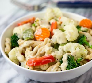 Recipe: Cut all the vegetables. Steam all the vegetables in a steamer or idli maker. Take a pan and put on flame. Add butter, when it melts add steamed vegetables. Pour soya milk and cook till the milk turns into a thick sauce. Add salt and cook for 1 minute. Garnish with cilantro and serve hot.